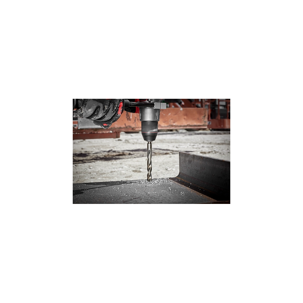 Engineered for extreme durability and extended life in demanding hard metal applications, the Milwaukee 1/2' RED HELIX Cobalt Drill Bit sets a new standard. Its innovative design incorporates a VARIABLE HELIX with an aggressive 35 angle that tapers to 15, ensuring rapid material extraction. The QUAD EDGE Tip provides four cutting edges for faster drilling and reduced heat buildup, while the Enhanced Tapered Web strengthens the bit's core for superior flute durability. Experience up to 15 times longer life compared to standard black oxide drill bits with this high-performance tool.
