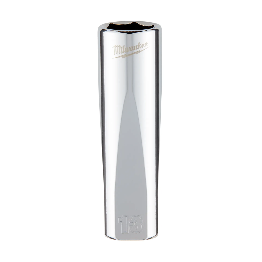 The MILWAUKEE 3/8' Drive 13mm Metric 6-Point Deep Socket with FOUR FLAT Sides is engineered from the ground up to be part of the most versatile socket family. This innovative tool features parallel flat sides that deter rolling and allow for wrench compatibility when additional leverage is required. Optimized deep well geometry helps reduce bolt rounding and stripping, while stamped sizes ensure easy visibility for fast identification on the job.