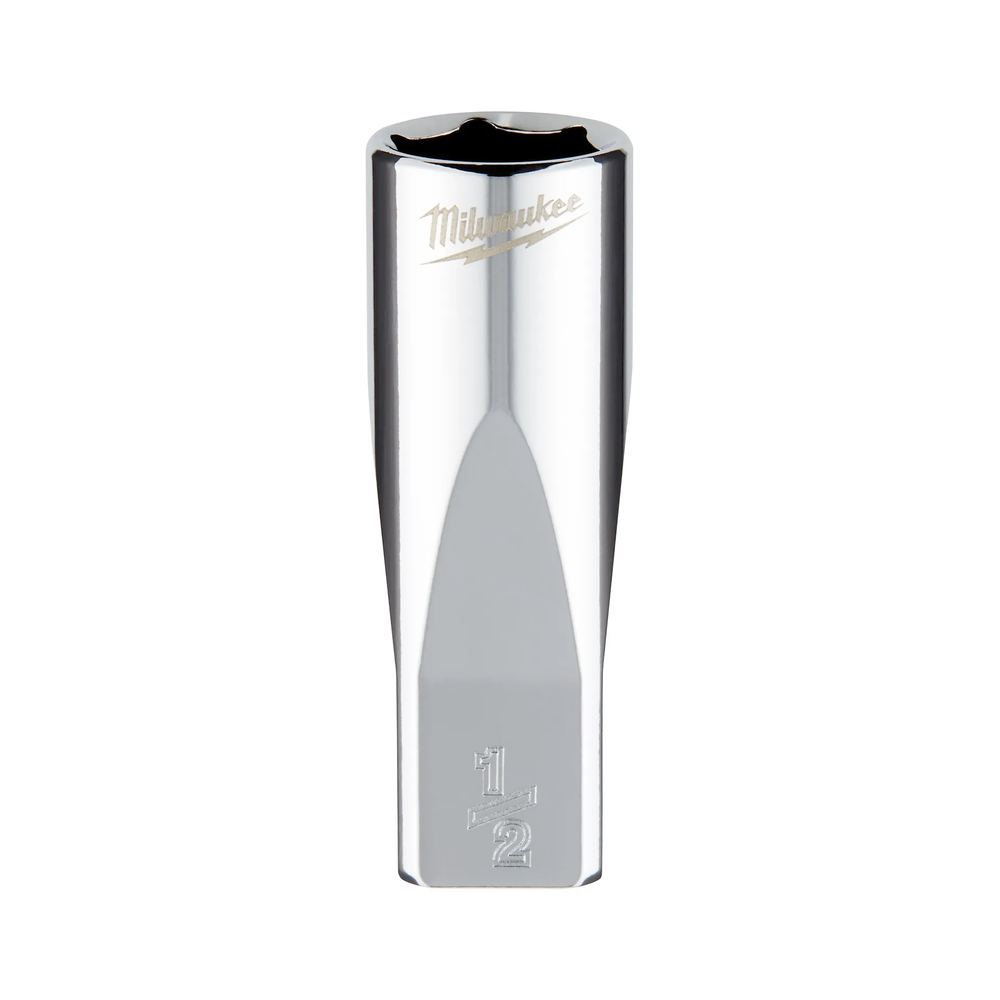 The Milwaukee 1/4' Drive 1/2' SAE 6-Point Deep Socket is engineered from the ground up to provide maximum versatility and durability on the jobsite. Featuring an innovative FOUR FLAT side design, this socket resists rolling when placed on flat surfaces and is wrench-ready for applications requiring additional torque. The optimized 6-point geometry is specifically designed to reduce bolt rounding and stripping, ensuring a secure fit on fasteners. With high-visibility stamped sizes and a premium chrome finish, this deep socket is a reliable addition to any professional tool kit.