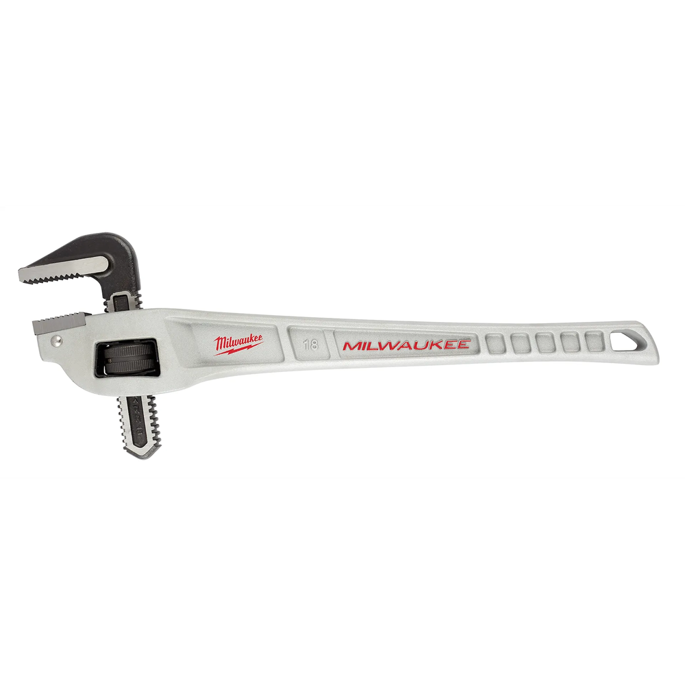 The Milwaukee 48-22-7185 is an 18-inch aluminum offset pipe wrench engineered from the ground up to maximize productivity for professional users. It features an aggressive offset head design that provides superior access to tight spaces and awkward overhead pipe runs where traditional wrenches struggle to gain a bite. The lightweight aluminum construction drastically reduces tool weight compared to cast iron, significantly lowering user fatigue during high-repetition plumbing installations. This wrench is a durable, professional-grade solution designed to handle the most demanding jobsites with ease.