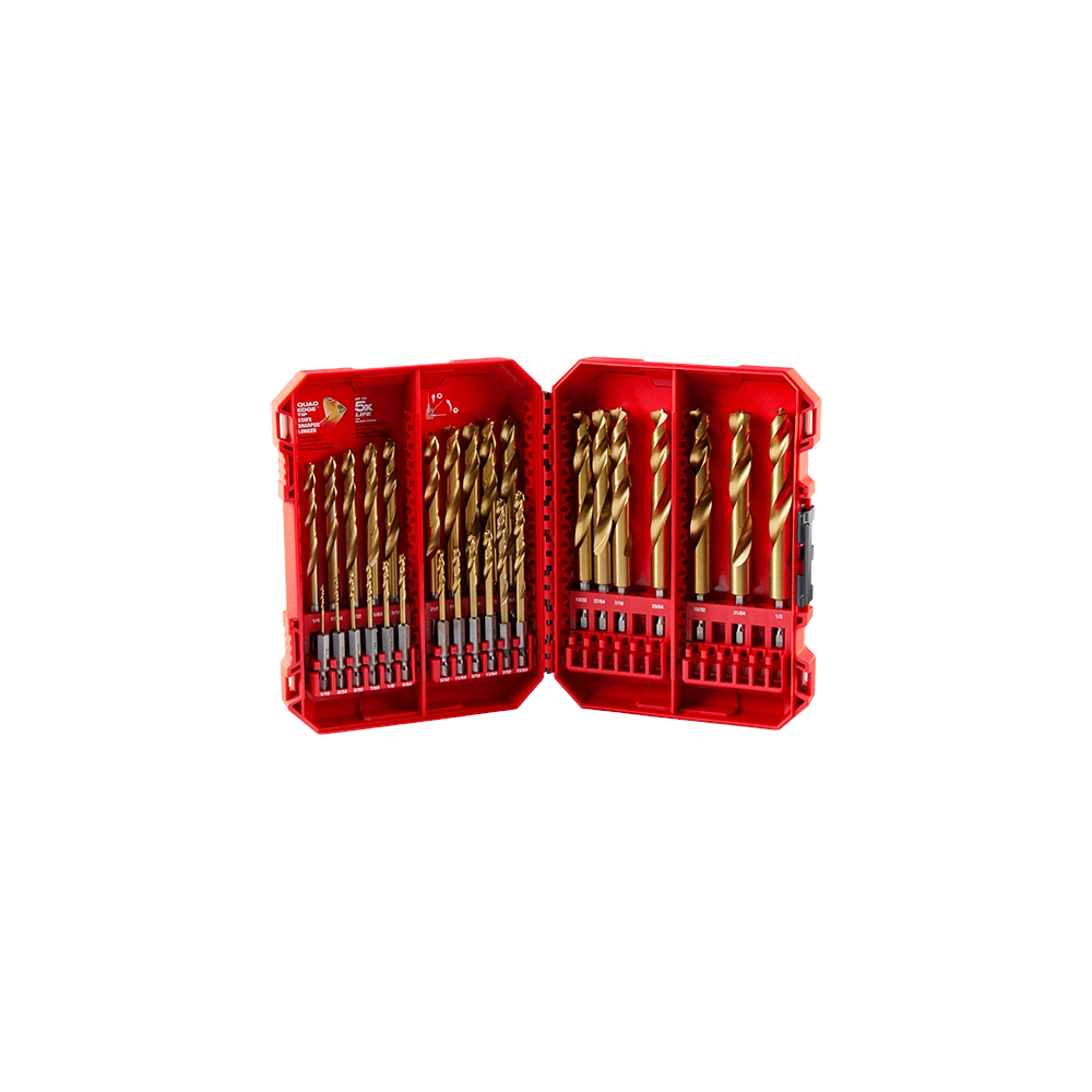 The Milwaukee SHOCKWAVE Impact Duty 29PC RED HELIX Titanium Drill Bit Set is engineered for extreme durability and long life, making it a valuable addition to any workshop or tool collection. The QUAD EDGE tip delivers a precision start and features four cutting edges to create smaller chips for faster material removal and less heat, leading to improved performance. Designed with a VARIABLE HELIX flute that begins with an aggressive 35 helical angle and ends at 15, these bits allow for rapid chip removal. The bits also feature a thicker tapered web, which greatly increases strength and reduces premature breakage.