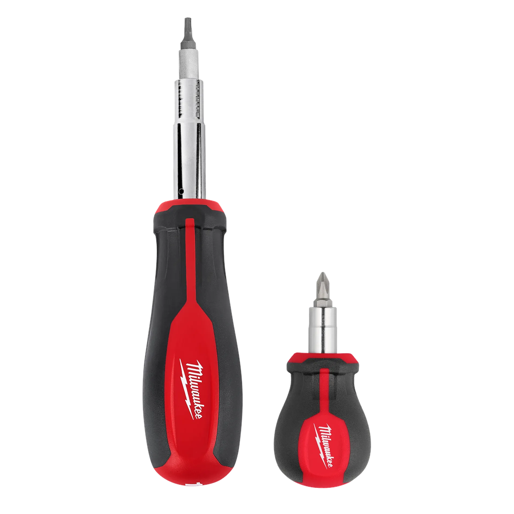 The Milwaukee 2PC Multi-Bit Screwdriver Set delivers professional-grade versatility by combining a full-size 11-in-1 driver with a compact 6-in-1 stubby driver. This set is engineered for jobsite efficiency, offering a wide array of bit sizes and nut drivers to handle common fastening tasks. The stubby screwdriver provides a short 3-inch profile, making it the ideal solution for gaining access to tight or confined spaces where standard drivers cannot fit. Both tools are built with ergonomic tri-lobe handles and durable bit holders to withstand the rigors of heavy daily use.