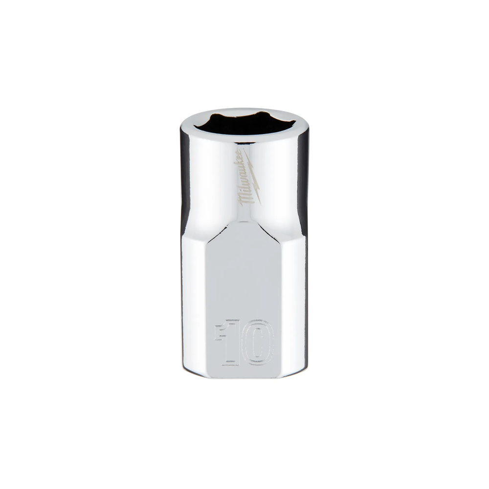 The Milwaukee 3/8' Drive 10mm Metric Socket is engineered from the ground up to be part of the most versatile socket family, specifically designed for professional users. It features an innovative FOUR FLAT design with four parallel flat sides that deter rolling on uneven surfaces and allow the socket to be used with an adjustable wrench for increased torque. With optimized geometry to reduce bolt rounding and high-visibility stamped markings, this socket ensures long-lasting performance and easy identification in any tool chest.