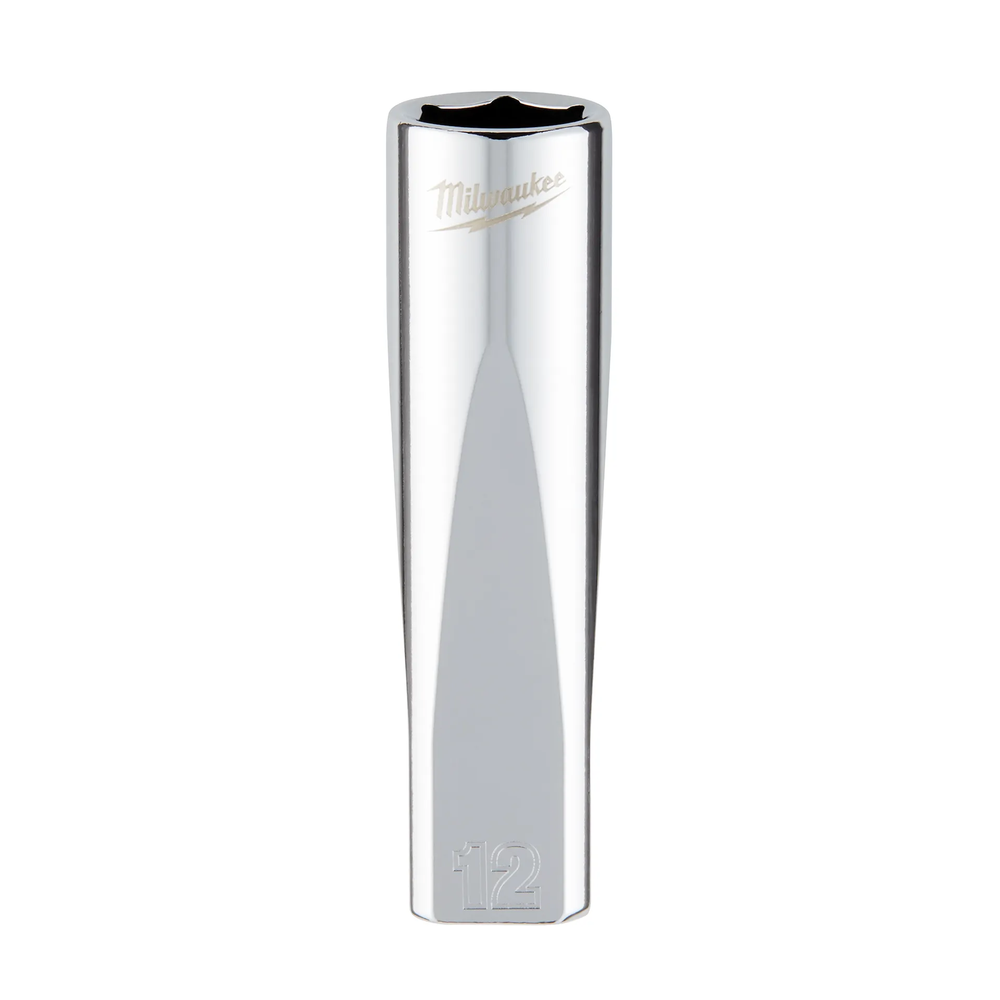 The Milwaukee 3/8' Drive 12mm Metric Deep Socket is engineered from the ground up to be part of the most versatile socket family. Featuring an innovative FOUR FLAT side design, this socket is designed to stay where you put it by deterring rolling on flat surfaces. The parallel flat sides also provide wrench compatibility for added torque when needed, while the deep well profile allows for easy access to recessed fasteners.