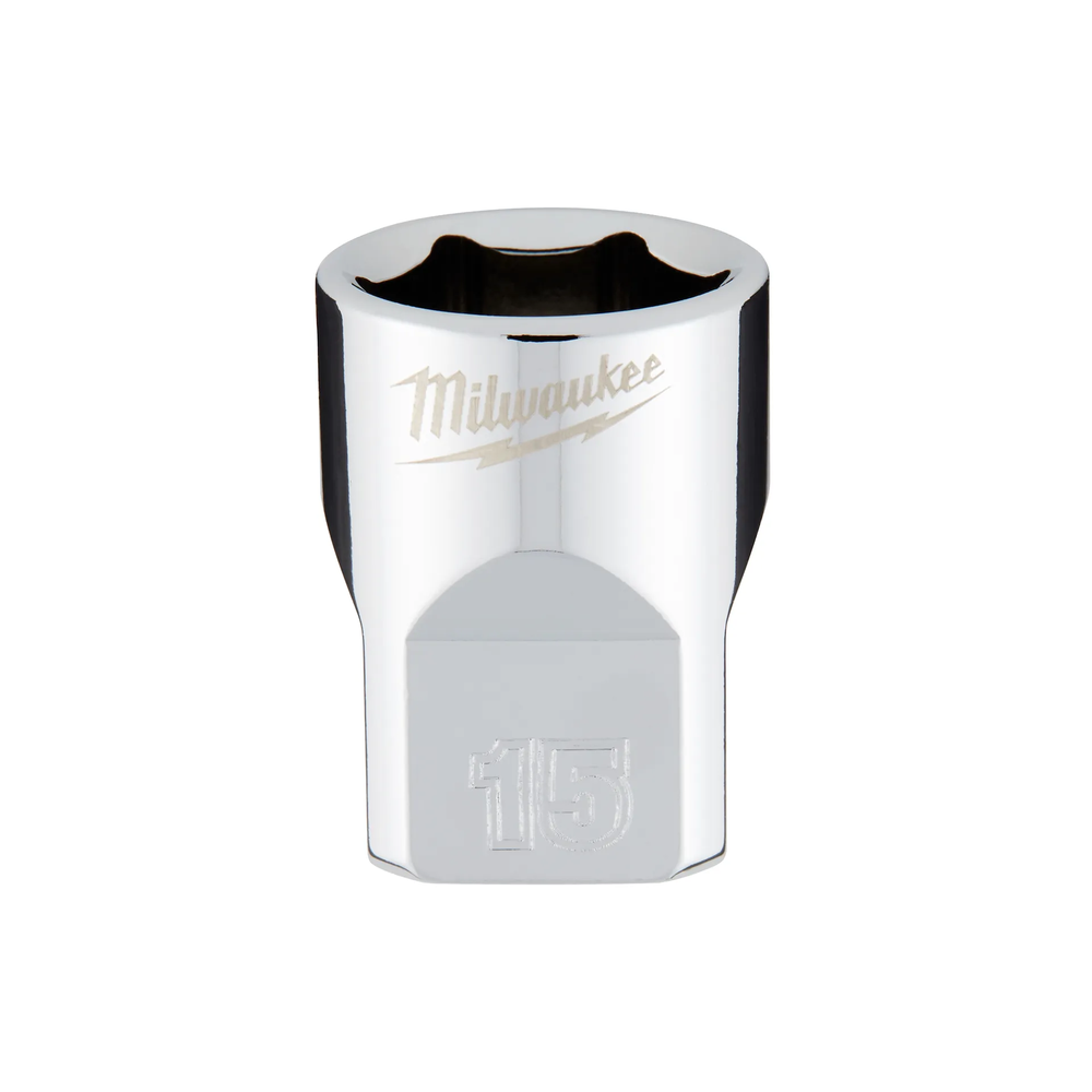 The Milwaukee 3/8' Drive 15mm Metric 6-Point Socket is designed from the ground up to be part of the most versatile socket family on the market. It features an innovative design with four parallel flat sides, which deter rolling and are wrench-ready for applications requiring extra leverage. The socket geometry is optimized to reduce bolt rounding and stripping, ensuring a secure fit on fasteners every time. This professional-grade hand tool is built to withstand the demands of the jobsite and is backed by a lifetime guarantee.