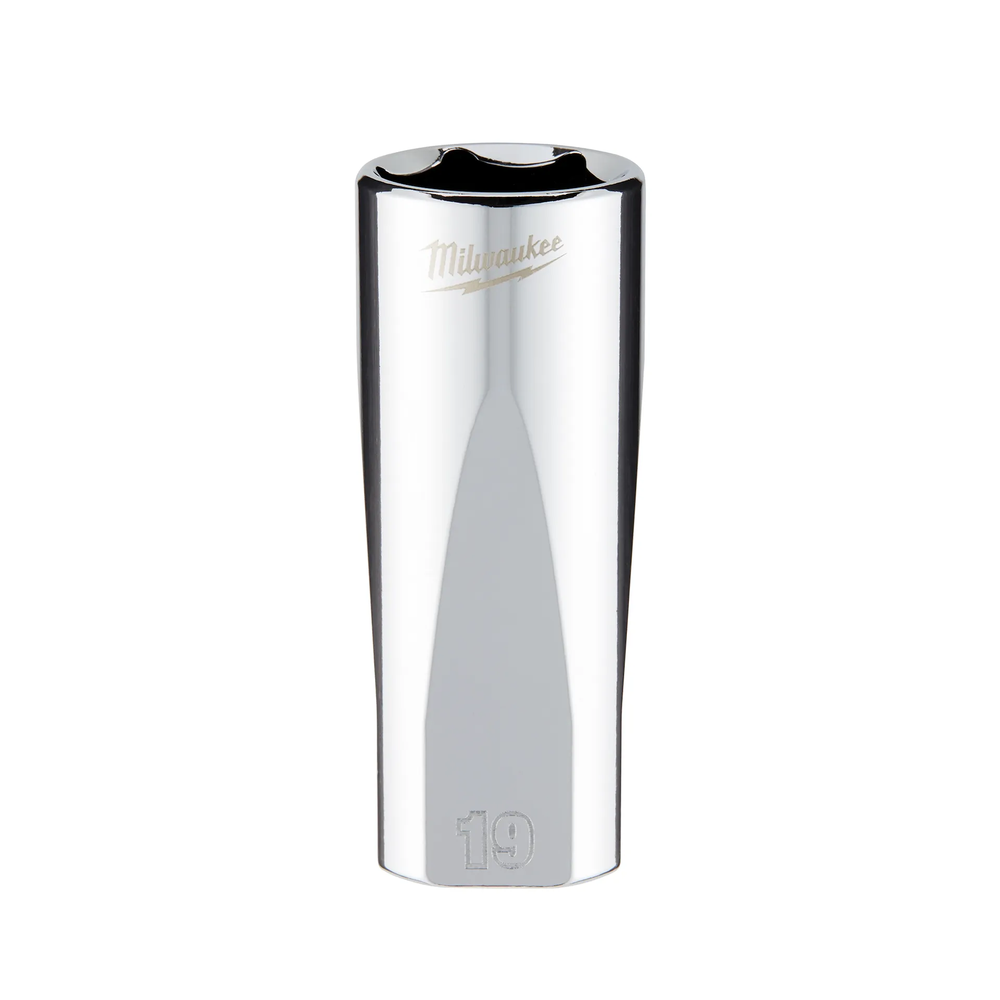 The Milwaukee 3/8' Drive 19mm Metric Deep Socket is engineered for maximum versatility and durability on the jobsite. Featuring an innovative FOUR FLAT side design, this socket resists rolling and provides wrench-ready compatibility for added leverage when needed. The optimized geometry is specifically designed to reduce bolt rounding and stripping, ensuring long-term fastener integrity. Backed by a lifetime guarantee, this chrome-finished socket is a reliable solution for professional mechanics and tradespeople.