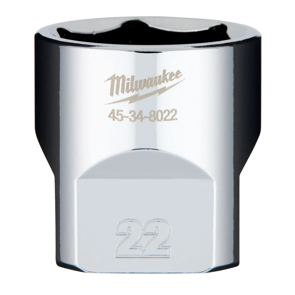 The Milwaukee 3/8' Drive 22mm Metric 6-Point Socket is engineered from the ground up to provide maximum versatility and durability on the job site. Featuring an innovative FOUR FLAT design, this socket is shaped to resist rolling on uneven surfaces and is fully wrench-compatible for applications requiring extra leverage. The socket's optimized geometry helps prevent fastener rounding and stripping, while the high-quality chrome finish provides long-lasting corrosion resistance and a professional look.