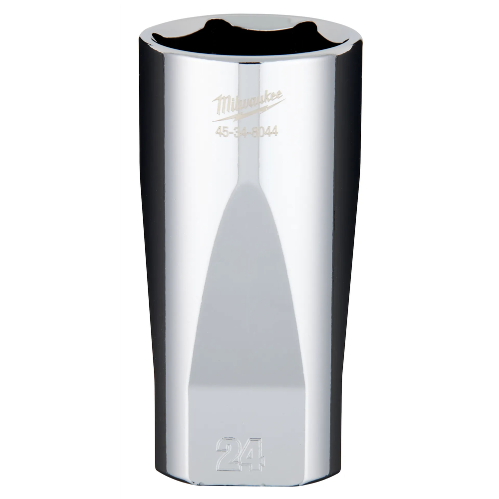 The Milwaukee 3/8' Drive 24mm Metric 6-Point Deep Well Socket is engineered from the ground up to be part of the most versatile socket family for professional users. Featuring the innovative FOUR FLAT side design, this socket is wrench-compatible and resists rolling when placed on flat surfaces. The optimized internal geometry is specifically designed to reduce bolt rounding and stripping, providing a more secure grip on fasteners. (Note: While some references may suggest communication accessories, this specific part number is confirmed as a premium chrome hand tool component.)