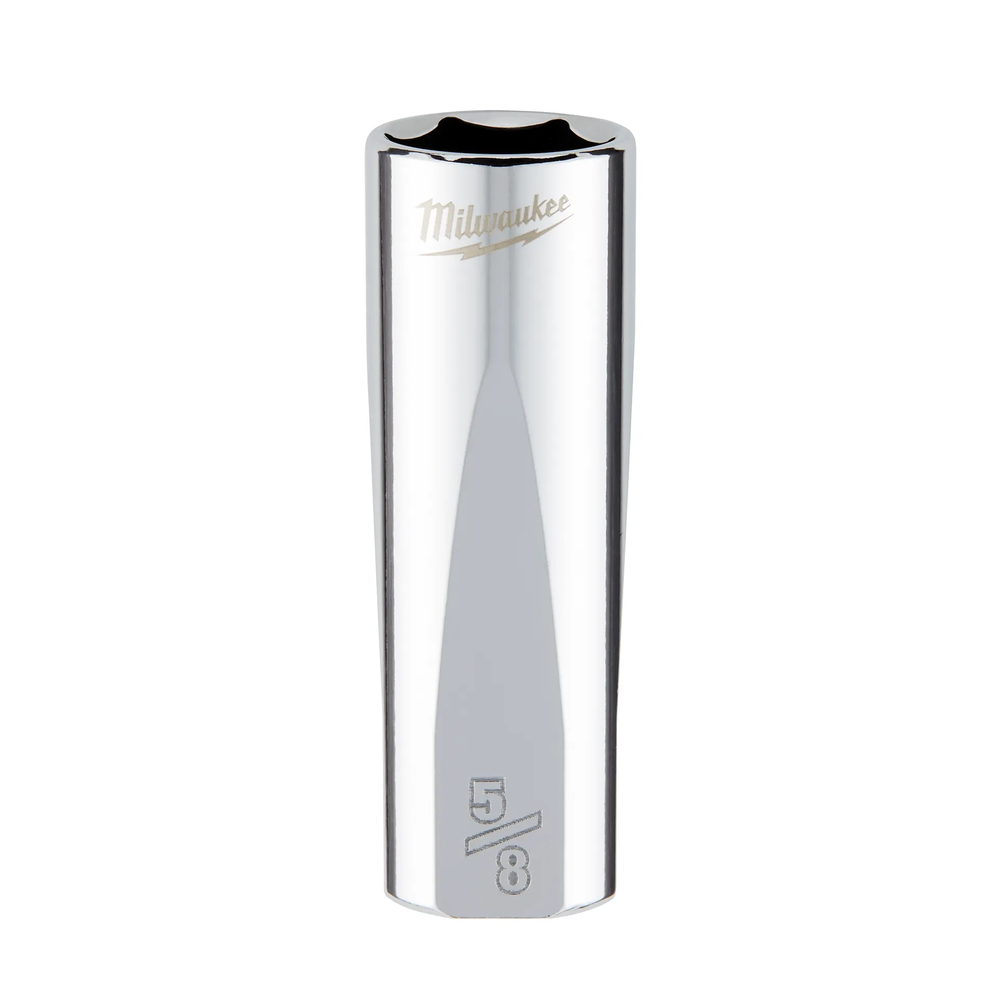 The MILWAUKEE 3/8' Drive 5/8' SAE 6-Point Deep Socket with FOUR FLAT Sides is engineered from the ground up to offer maximum versatility and durability on the job site. Featuring an innovative design with four parallel flat sides, this socket is wrench-ready and resists rolling across flat surfaces. The deep well geometry is optimized to prevent bolt rounding and stripping, while large stamped sizes ensure easy identification in any environment. Backed by a lifetime guarantee, this chrome-finished socket provides a reliable solution for heavy-duty fastening tasks.
