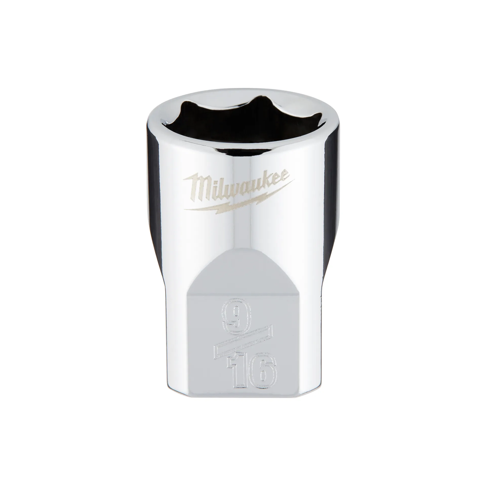 The Milwaukee 3/8' Drive 9/16' SAE Socket is engineered from the ground up to provide maximum versatility and durability for professional mechanics. Featuring an innovative FOUR FLAT side design, this socket is wrench-compatible and resists rolling when placed on flat surfaces. The large stamped sizes provide easy-to-read visibility for quick identification during high-paced tasks. Optimized geometry helps prevent bolt rounding and stripping, ensuring a reliable grip on fasteners every time. Backed by a lifetime guarantee, this chrome-finished tool is a dependable addition to any automotive or general maintenance toolkit.