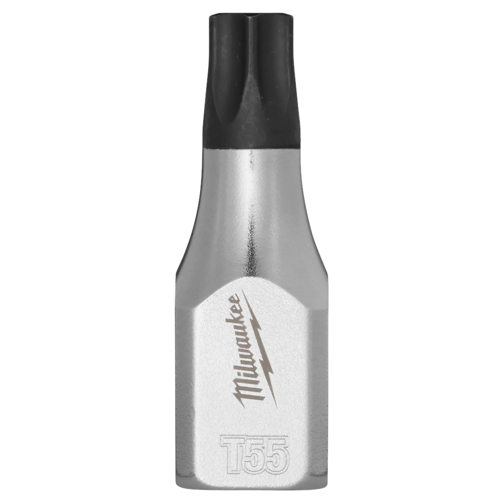 The MILWAUKEE 3/8' Drive T55 Tamper Proof TORX Bit Socket is designed from the ground up to be part of the most versatile socket family. Featuring an innovative FOUR FLAT side design, this socket deters rolling on the jobsite and provides a wrench-ready surface for additional leverage. The one-piece construction offers significantly improved durability over standard two-piece designs, ensuring the bit remains securely attached to the base during high-torque applications.