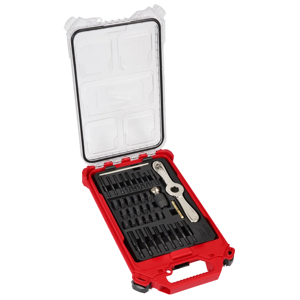 The Milwaukee 38-Piece Metric Tap & Die PACKOUT Set provides a comprehensive solution for threading tasks, featuring precision-machined accessories for common applications. This set is centered around the versatile Hex-LOK 2-in-1 Handle, which accommodates both taps and dies, streamlining the threading process. The taps and dies are coated in black oxide for corrosion resistance and have laser-etched markings for easy size identification. Housed in a PACKOUT Low-Profile Compact Organizer, this set offers easy transport and organization on the job site.