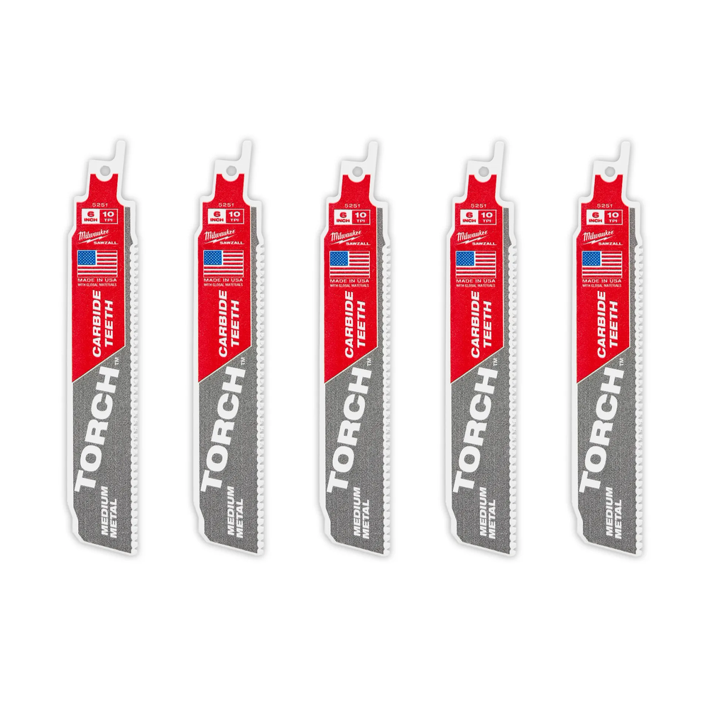 The Milwaukee 48-00-5551 TORCH Carbide Teeth SAWZALL blade is engineered to deliver extreme life and unmatched versatility in medium metal applications. Utilizing high-grade carbide teeth, this blade provides up to 50 times the life of standard bi-metal blades when cutting through tough materials like EMT conduit, strut, and stainless steel pipe. The 10 TPI design is optimized for providing smooth, fast cuts while the 1-inch tall blade body ensures stability and precision on the job. Please note that while the series is available in multiple pack sizes, this specific model number designates the 5-pack configuration.
