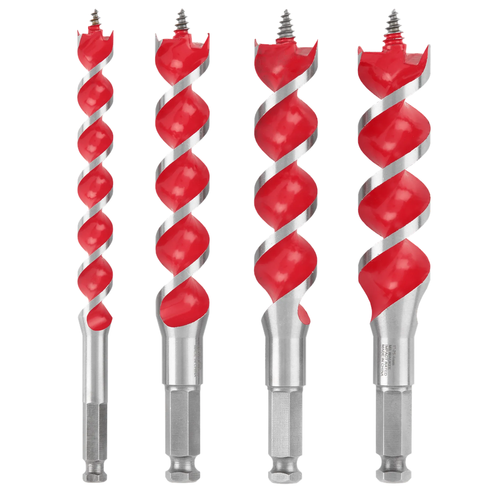 Engineered for high-speed, clean hole drilling in wood, the Milwaukee 48-13-4000 Spur Auger Bit Set is ideal for electrical, plumbing, and framing tasks. This 4-piece set features bits designed for efficient chip ejection and reduced breakout, ensuring smooth performance. The double-wing spurs provide accurate scribing and clean entry, while a non-stick coating minimizes friction for consistent feed rates through various wood materials. Optimized for use with impact and drill drivers, these bits offer durability and efficiency for rough-in work.