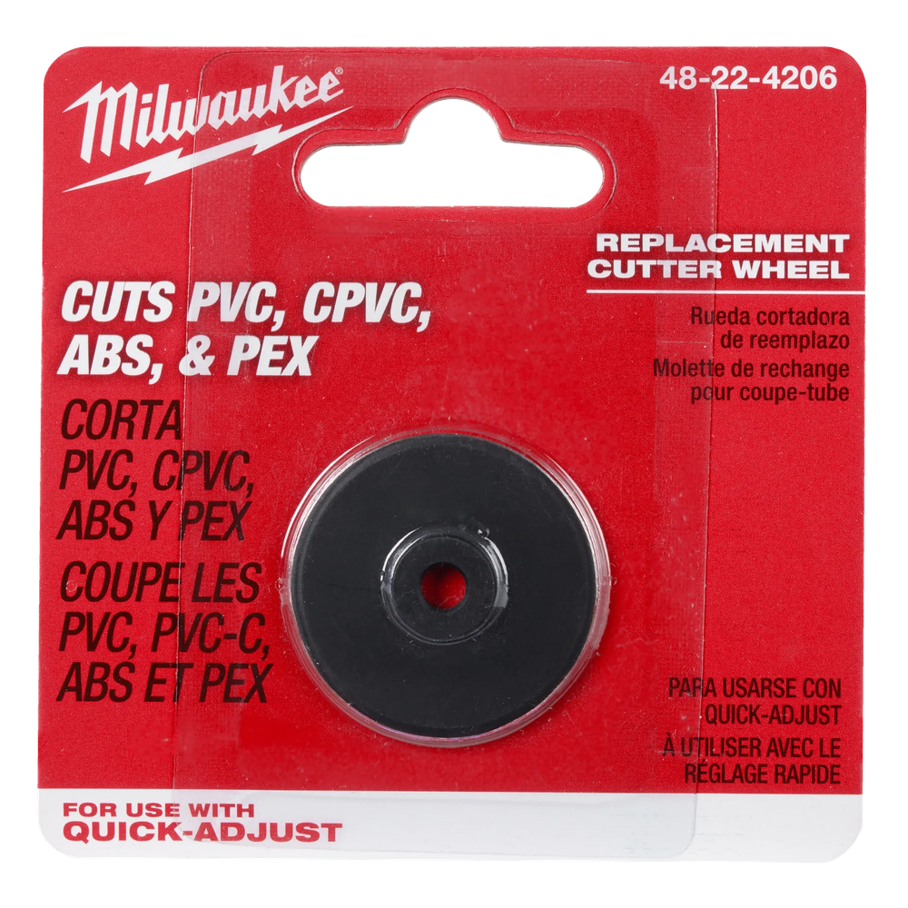 The Milwaukee 48-22-4206 is a high-performance replacement cutter wheel specifically engineered for cutting large diameter plastic piping. Designed for use with Milwaukee's quick adjust tubing cutters, this wheel delivers exceptionally straight and clean cuts through PVC, CPVC, ABS, and PEX materials. Its high carbon steel construction ensures maximum durability and long-lasting edge retention, making it an essential accessory for service professionals who require precision in high-volume drainage and supply applications.