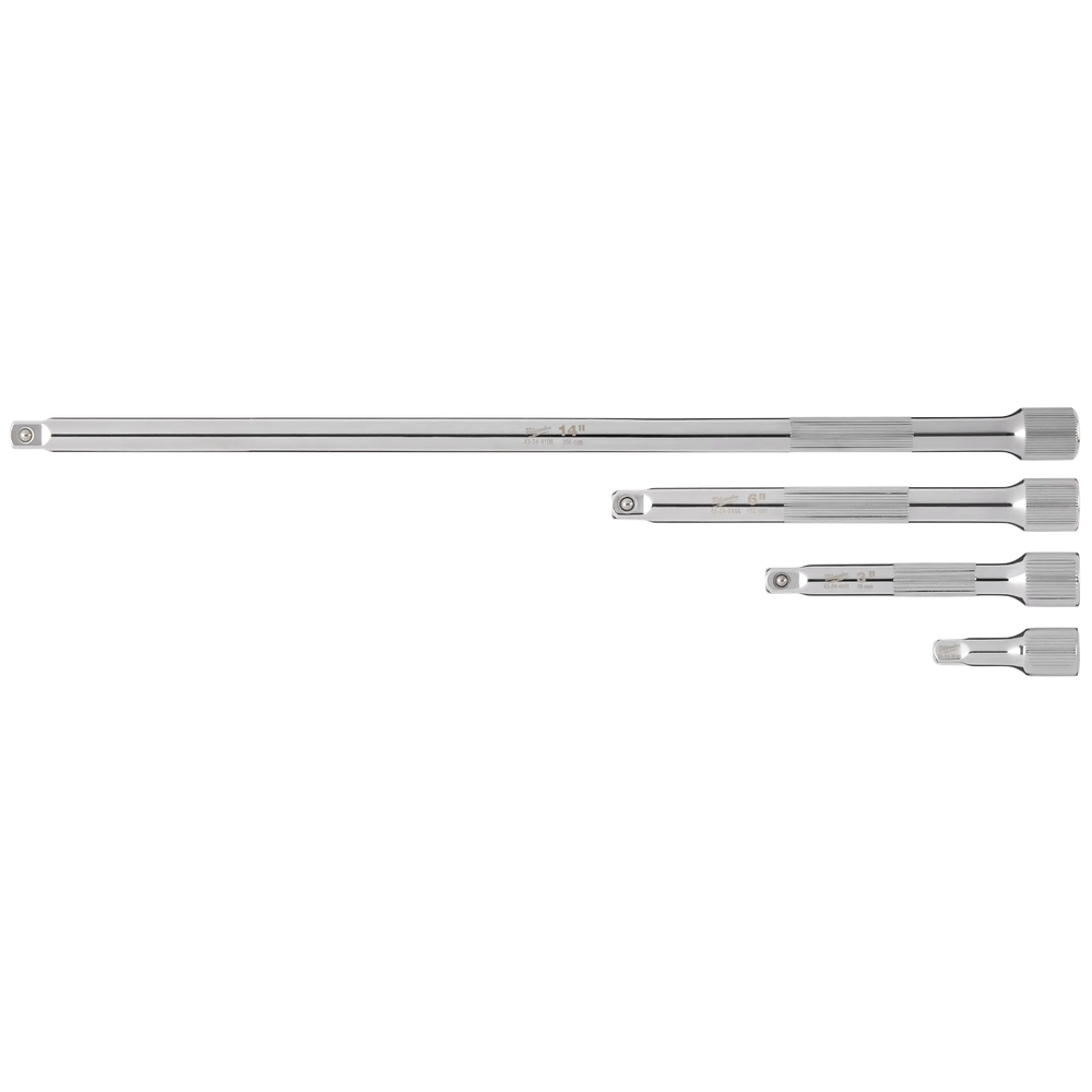 The Milwaukee 48-22-9340 4pc 1/4 Drive Extension Set is engineered to provide professionals with superior access and control in tight, hard-to-reach spaces. These extensions feature the industry's largest knurling surface, allowing for precision handling and easier hand-tightening of fasteners even when working with oily materials. Crafted from high-strength chrome vanadium steel and finished with a protective chrome plating, this set is built to withstand heavy jobsite use and is backed by a lifetime guarantee.