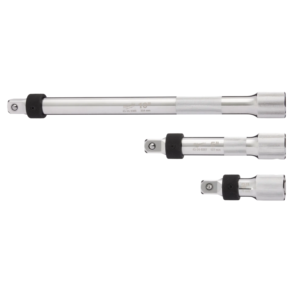 The Milwaukee 48-22-9362 3pc 1/2 Drive Locking Extension Set is engineered to provide professional users with maximum control and security when working in tight or recessed areas. Each extension features a large knurled surface for precision hand-tightening and a robust locking collar that ensures sockets stay firmly attached during heavy use. Made from durable chrome vanadium steel and finished with polished chrome, this set is built to resist corrosion and withstand demanding jobsite environments.