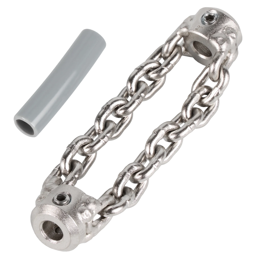 The Milwaukee 48-53-3034 2' Standard Chain Knocker is designed to deliver a thorough wall-to-wall clean, effectively tackling soft blockages and build-up in pipes. This accessory is particularly well-suited for use in PVC or fragile pipes, offering a safer cleaning solution. Its durable construction ensures it can handle tough clogs, while stainless steel set screws provide resistance against corrosion, extending the tool's lifespan. The chain knocker is engineered to navigate tees and bends with ease, making it a versatile tool for various drain cleaning tasks.