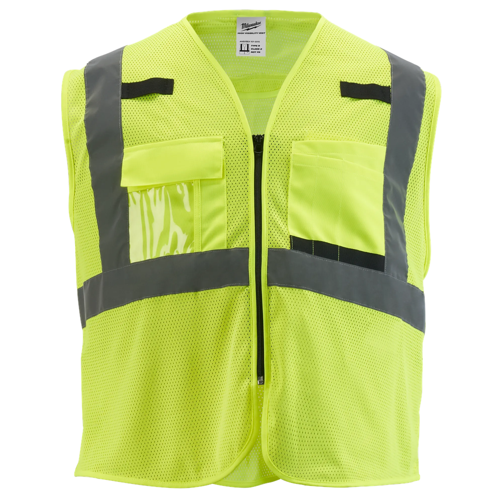 Stay cool and visible on the job with the Milwaukee Class 2 High Visibility Yellow Mesh Safety Vest in size 2XL/3XL. This vest is designed with lightweight, breathable mesh and moisture-wicking, anti-microbial fabric to keep you comfortable and odor-free, even in hot working conditions. It offers ample storage with 9 pockets, including a clear ID holder and an internal pocket, and features a durable pass-through slit for fall protection gear. The secure zipper closure ensures ultimate job site security. Recommended for work environments with traffic under 50 mph or around heavy machinery, this vest is ideal for construction, road work, utility crews, and survey crews.