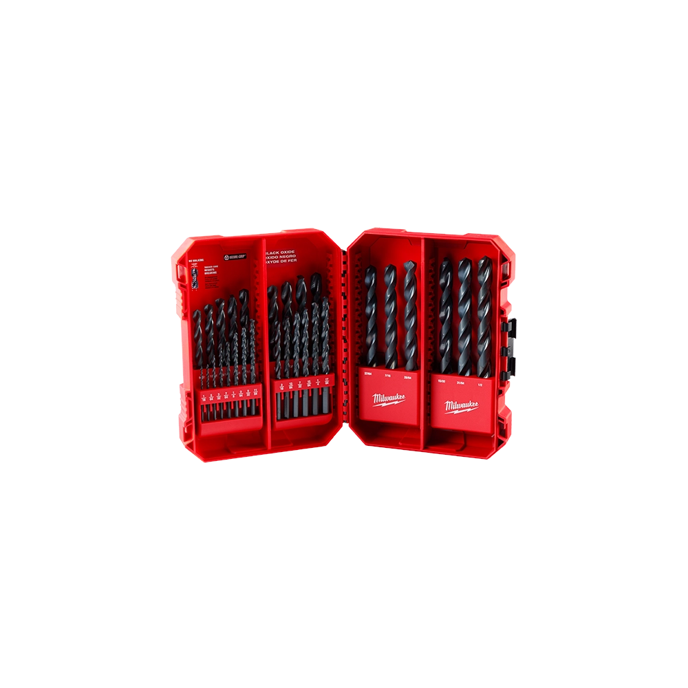 Experience heavy-duty performance with the Milwaukee Thunderbolt 29-Piece Black Oxide Drill Bit Set. Engineered for extreme durability and long life, these bits feature a black oxide coating that reduces heat buildup and provides superior corrosion resistance. The robust Thunderbolt web design offers enhanced strength, protecting against side-load breakage, while the parabolic flute form efficiently clears chips to maintain bit coolness. Ideal for various applications in wood, plastics, and metals, this set ensures precision and accuracy with every hole. It also comes organized in a customizable accessory case designed for use with the Milwaukee PACKOUT system.