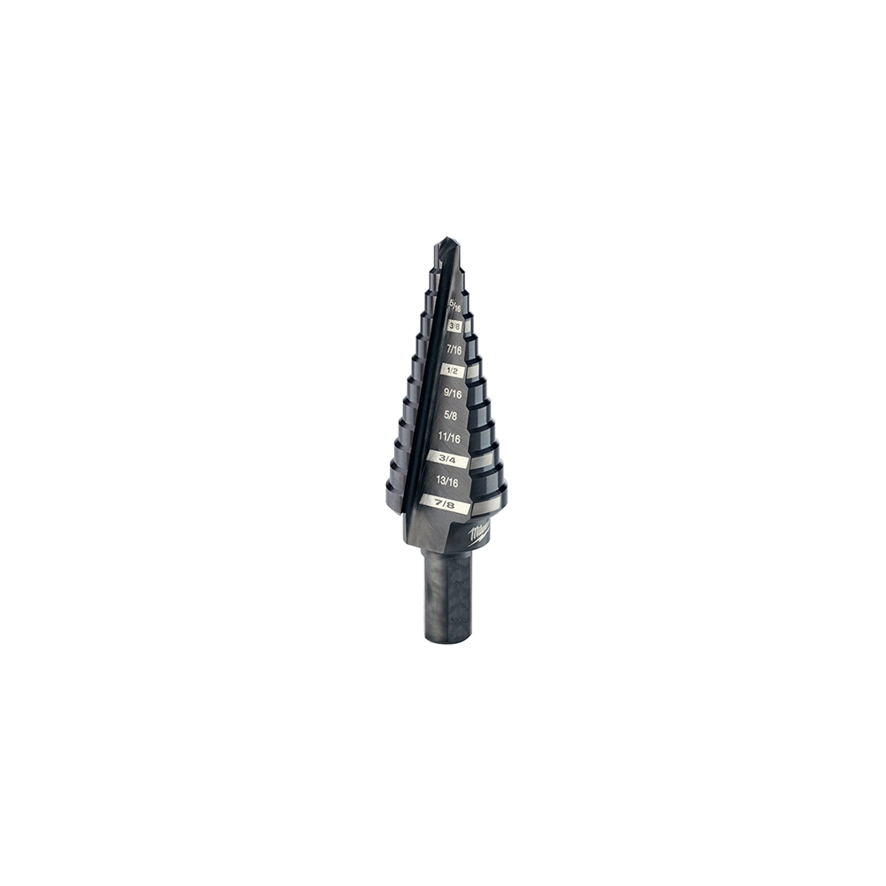 Drill through metal and plastic with the Milwaukee 48-89-9204 #4 Step Drill Bit. This versatile tool offers 12 hole sizes ranging from 3/16' to 7/8', allowing for precise drilling in a variety of applications. Its dual-flute design ensures jam-free performance and up to 2X faster drilling speeds, while the Rapid Strike tip provides quick, accurate starts with less heat generation. The black oxide coating enhances durability and extends bit life, making it an efficient choice for professionals seeking greater productivity.