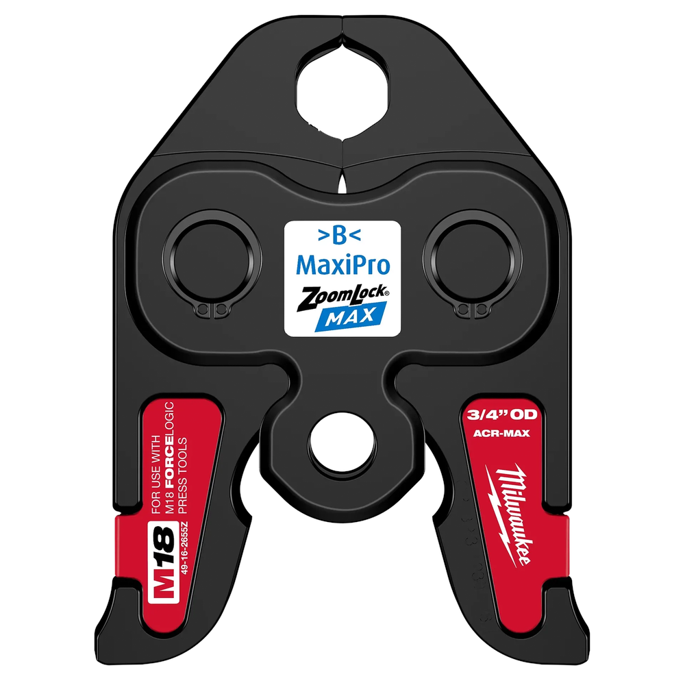 The Milwaukee 3/4' ZoomLock MAX Press Jaw Kit is designed for pressing ZoomLock MAX Press Fittings and optimized for use with Milwaukee M18 FORCE LOGIC Press Tools. This tool offers a flame-free alternative to traditional brazing, providing up to 60% faster connections for HVAC and refrigeration systems. It eliminates the need for nitrogen purges, combustible gasses, and silver solder, making installations more efficient and safer. The inline design allows for one-handed operation and excellent access in tight spaces.