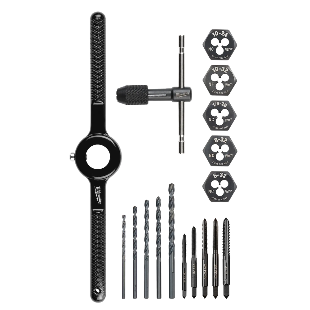 The Milwaukee 17-Piece SAE Tap and Die Set is designed for precision threading applications, offering a comprehensive solution for creating and repairing threads in various metal materials. This set includes precision machined threading accessories and handles, featuring durable high carbon steel taps and dies with a protective black oxide coating for enhanced corrosion resistance. Laser-etched sizing ensures clear and long-lasting markings, while the plug taps are designed for through-hole threading and hex dies are compatible with standard die stocks. This set is ideal for common applications and is designed for use with drill drivers, making it a versatile addition to any mechanic's or DIYer's toolkit.