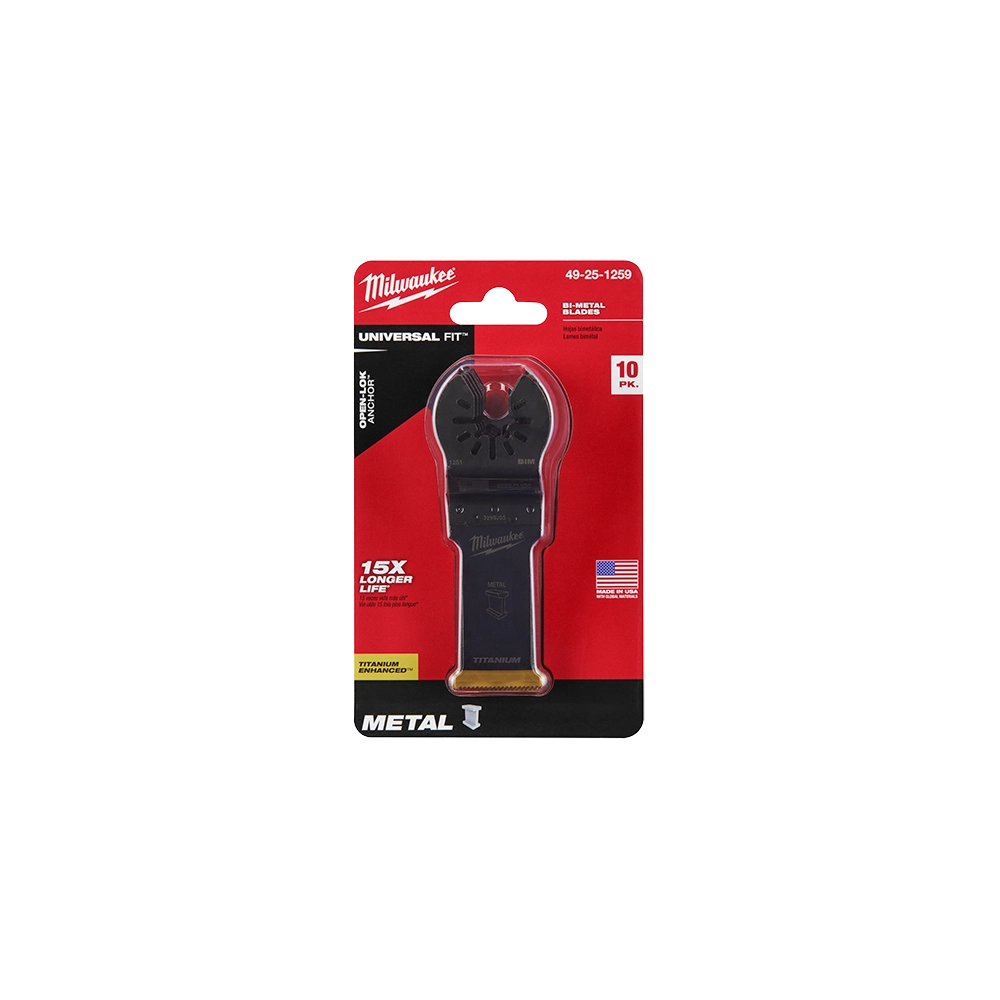 Experience superior cutting performance with the Milwaukee 49-25-1259 OPEN-LOK Oscillating Multi-Tool Blade. Designed for versatility, this 1-1/8' bi-metal blade features a titanium enhancement for extended durability and faster cuts. Its optimized tooth geometry and slightly narrower cutting width allow for precise plunge cuts in a variety of materials including soft metals, wood, nails, PVC, and drywall. The universal fit OPEN-LOK anchor ensures quick and secure blade changes across major oscillating multi-tool brands.