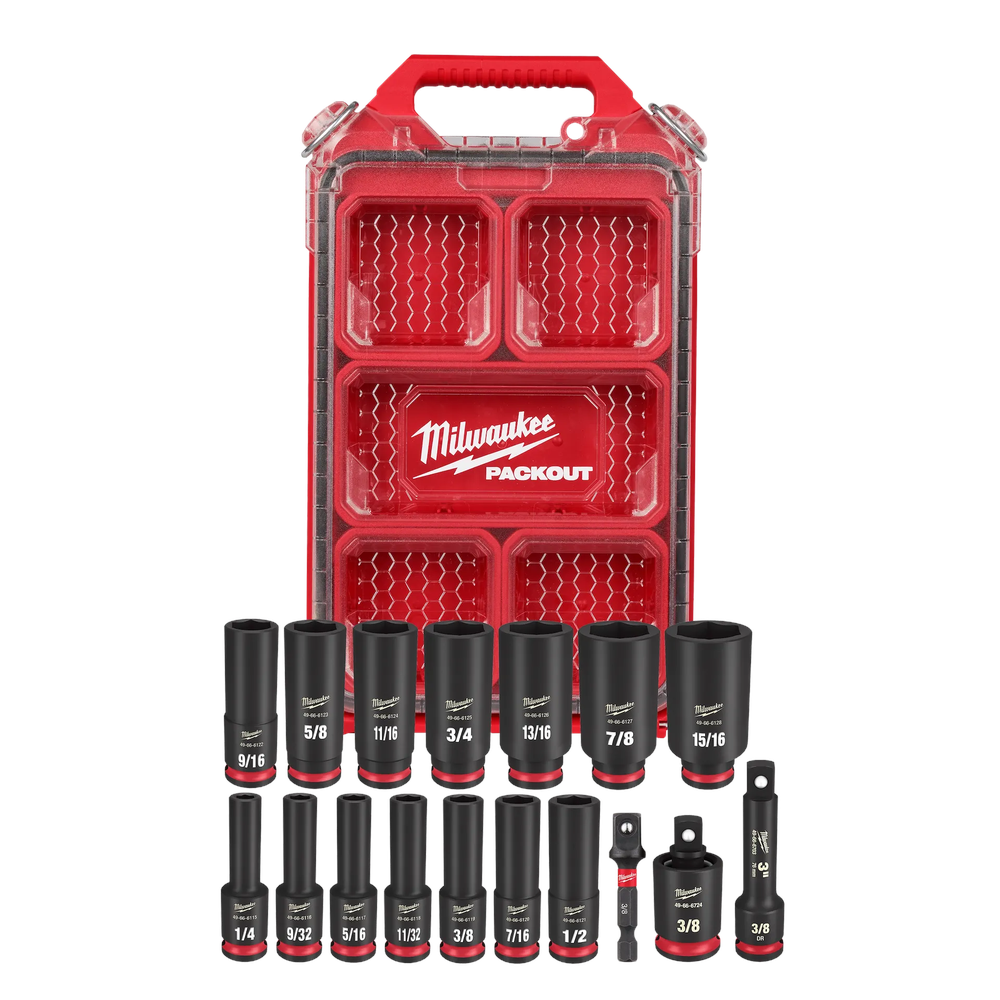 Experience extreme durability and precision with the Milwaukee 49-66-6800 SHOCKWAVE Impact Duty Socket Set. This 17-piece SAE set is engineered for high-torque applications, featuring high-strength forged steel construction for superior performance. The stamped and ink-filled size markings ensure easy identification and longevity, while the non-slip hex geometry prevents fastener rounding for a secure grip. Integrated into the versatile PACKOUT Modular Storage System, this set offers organized and protected storage, making it ideal for any job site.