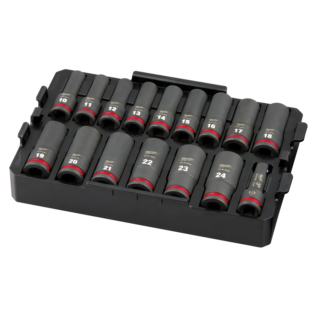 Experience extreme durability and lasting visibility with the Milwaukee 49-66-6818 SHOCKWAVE Impact Duty Socket Set. Engineered with high-strength forged steel, these 1/2' drive metric sockets are built to withstand high torque applications and the rigors of jobsite use. The stamped and ink-filled size markings provide clear, long-lasting identification, ensuring you always select the correct socket. Designed for professional performance, the set features a non-slip hex geometry to prevent fastener rounding and comes with a removable tray compatible with Milwaukee's PACKOUT organizers.