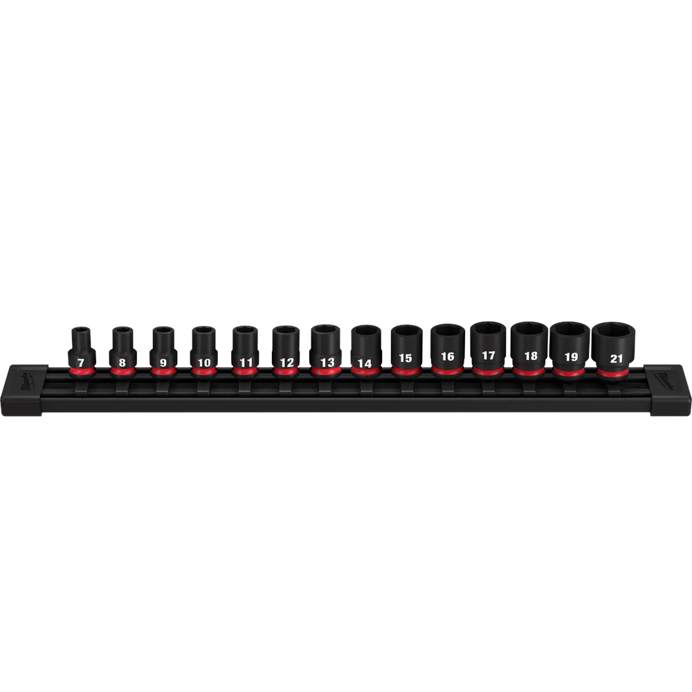 Engineered for extreme durability in high-torque applications, the Milwaukee 14-Piece SHOCKWAVE Impact Duty 3/8' Drive Metric Standard 6 Point Socket Set is built to last. Featuring the boldest and longest-lasting markings for easy identification, these sockets ensure you select the correct size every time. Constructed from high-strength forged steel, they offer optimized performance for heavy-duty tasks, while the non-slip hex geometry prevents fastener rounding for reliable use. The set includes a socket rail with customizable and removable end caps for efficient storage.