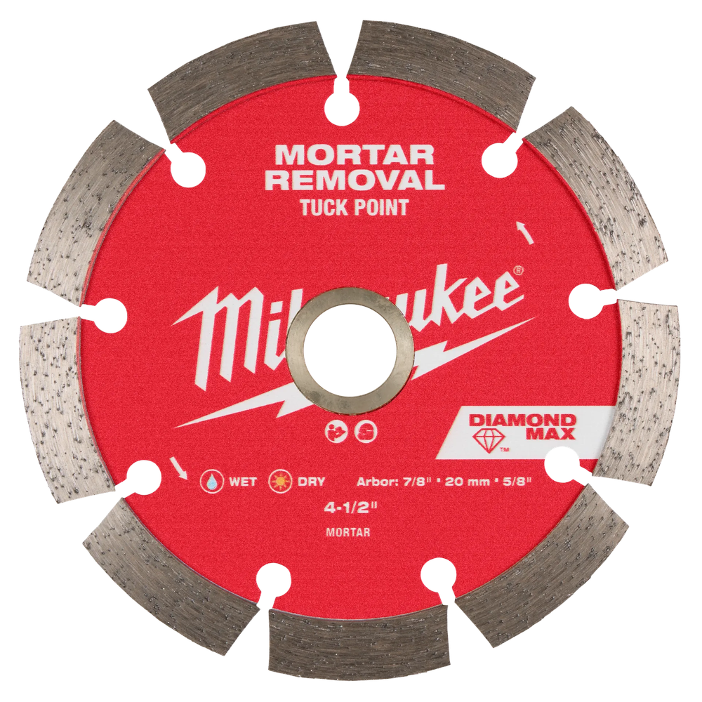 Experience superior mortar removal and enhanced productivity with the Milwaukee DIAMOND MAX Tuck Point Diamond Blade. Engineered with a specialized diamond formula, this blade offers an extended lifespan, providing up to 5X more life in mortar applications. Its 1/4' wide kerf ensures efficient material removal and delivers exceptionally clean finishes, while keyhole gullets facilitate rapid debris expulsion, making it ideal for demanding masonry tasks.