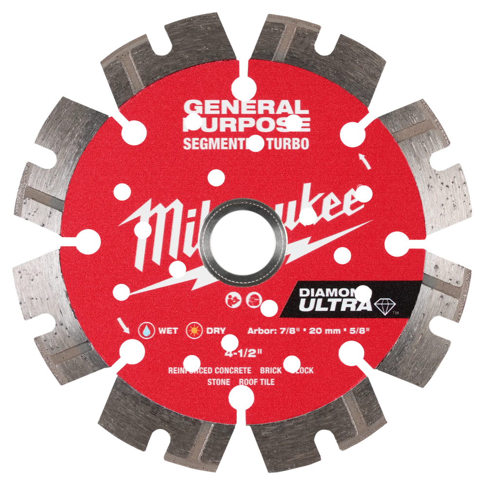 Engineered for professionals, the Milwaukee 49-93-7523 DIAMOND ULTRA Segmented Turbo General Purpose Diamond Blade delivers exceptional cutting speeds and maximum run time to boost productivity. Its innovative turbo notch design allows for up to 2.5x faster cutting in concrete, while laser-welded segments ensure increased durability in demanding materials like cured and reinforced concrete, stone, brick, and block. The vented steel core keeps the blade cool for consistent performance and extends run time by up to 75%, making it ideal for intensive use. Keyhole gullets facilitate rapid debris removal, further enhancing blade life and efficiency.