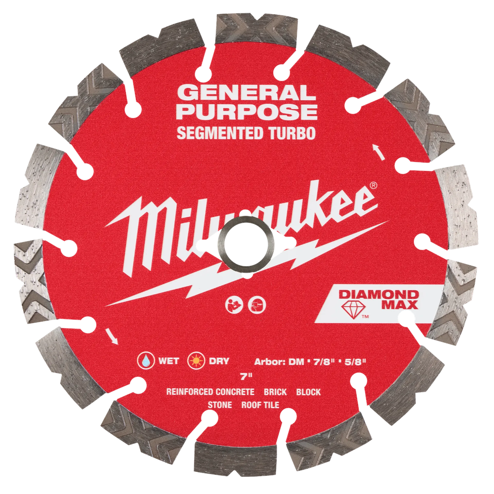 Experience up to 5x longer life and ultimate control with the Milwaukee 49-93-9007 DIAMOND MAX Segmented Turbo General Purpose Diamond Blade. Its alternating turbo x-segments ensure faster, more controlled cuts, while laser-welded segments provide enhanced durability in tough materials like cured concrete and concrete with rebar. Designed for rapid debris removal with slanted keyhole gullets and cooler operation thanks to a vented steel core, this blade is ideal for both wet and dry applications. It efficiently cuts through concrete, brick, block, stone, and roof tile, making it a versatile tool for various construction and renovation tasks.