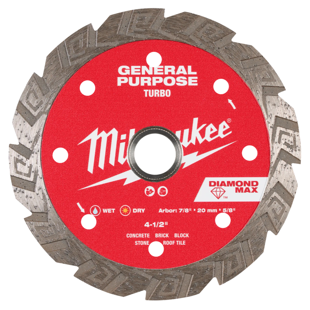 The MILWAUKEE DIAMOND MAX Turbo General Purpose Diamond Blades deliver exceptional power for cutting through hard aggregate. Engineered with a unique diamond formula, these blades offer up to 5 times longer life in concrete. The serrated turbo rim maintains consistent speed and power, while the notched turbo edge ensures cleaner finishes. A vented steel core provides cooler cutting, ensuring consistent performance throughout the blade's lifespan. This blade is suitable for both wet and dry use, making it a versatile choice for various professional applications.
