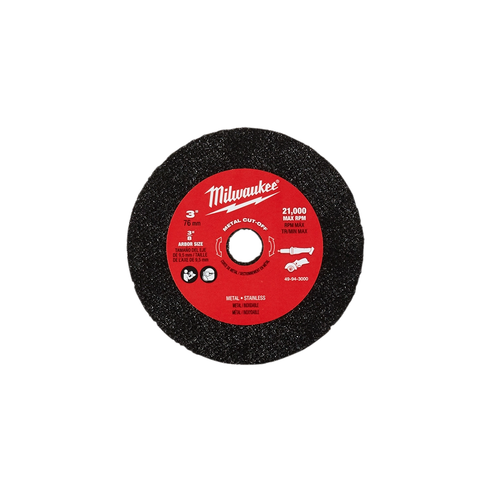 The Milwaukee 49-94-3000 is a three-pack of 3-inch metal cut-off wheels, designed for efficient cutting of various metals, including stainless steel. These wheels are rated for a maximum of 20,000 RPM, making them a reliable solution for quick and precise metal fabrication tasks. As part of Milwaukee's extensive abrasive offering, these wheels provide a balance of general-purpose performance and specialized application capabilities.