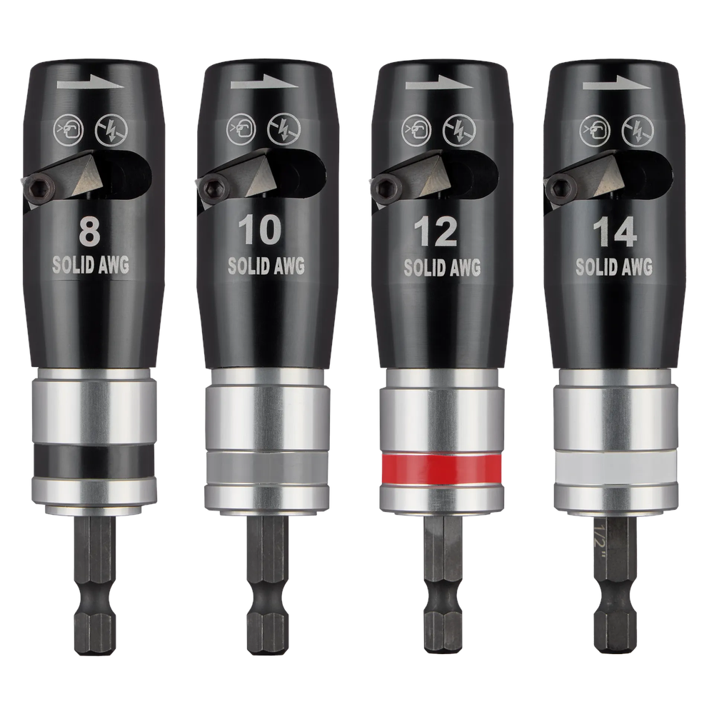 The Milwaukee 48-32-6406 4PC Solid AWG Wire Stripper Set delivers fast, clean stripping for 8-14 AWG solid wire. Designed for use with impact drivers, these tools feature an adjustable shank with convenient strip length markings from 1/2 inch to 1-1/2 inches to ensure consistent results. The color-coded rings allow for quick identification on the job site, providing professionals with a reliable and efficient solution for high-volume electrical work.