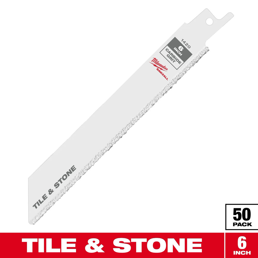 The Milwaukee 48-01-6420 is a 50-pack of high-performance 6-inch Carbide Grit SAWZALL blades designed for cutting tough, abrasive materials. These blades are specifically engineered to tackle ceramic tile, plaster, masonry, brick, and fiberglass where traditional toothed blades would quickly fail. Featuring a durable tungsten carbide grit edge, they deliver a long service life and fast cutting speeds in specialized demolition and renovation applications. This bulk pack is ideal for professional tradespeople and contractors who require a consistent supply of reliable accessories for heavy-duty jobsite tasks.