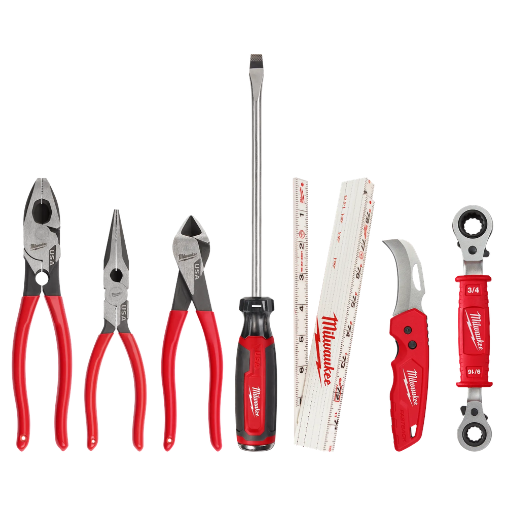 The Milwaukee 7-Piece Power Utility Hand Tool Set is a professional-grade collection specifically curated for power linemen, apprentices, and journeymen. This comprehensive set features high-performance tools engineered for durability and precision, including USA-made pliers and screwdrivers designed for the toughest jobsites. Each tool is optimized to provide maximum leverage and comfortable grip, ensuring reliability and safety during electrical and utility maintenance tasks.