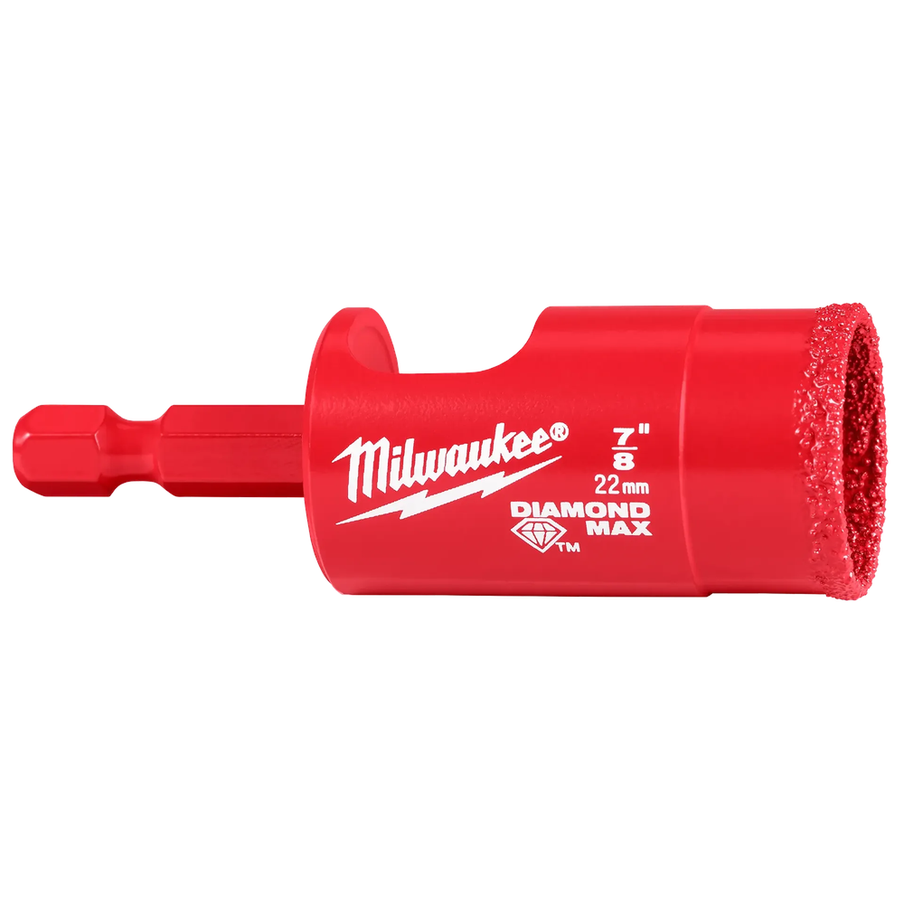 The MILWAUKEE Diamond Max 7/8' Hole Saw Bit delivers up to 20X longer life with unmatched cuts in porcelain and other demanding materials. This tool offers best-in-class performance due to higher-grade diamonds and superior retention, ensuring maximum wear resistance. Its improved diamond grit provides faster cutting and a cleaner entry into material, designed for more cutting with less clogging. It is ideal for tackling tough applications like tile, stone, and glass.