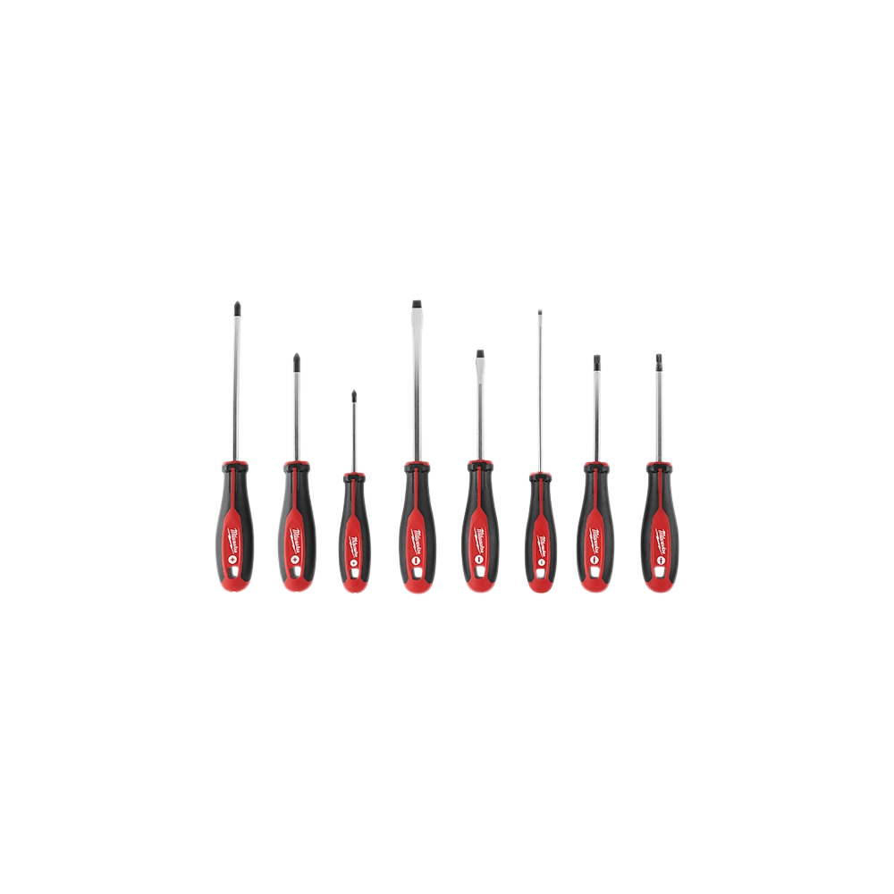 The Milwaukee 48-22-2708 8-Piece Screwdriver Set is a professional-grade tool kit designed for maximum durability and efficiency on the jobsite. Featuring forged steel shanks and hardened magnetic tips, these screwdrivers are engineered to resist cam-out and provide a precise fit for high-cycle industrial use. The ergonomic tri-lobe handle design allows users to comfortably apply more leverage, while specialized ECX bits provide a superior fit for electrical fasteners to prevent stripping.
