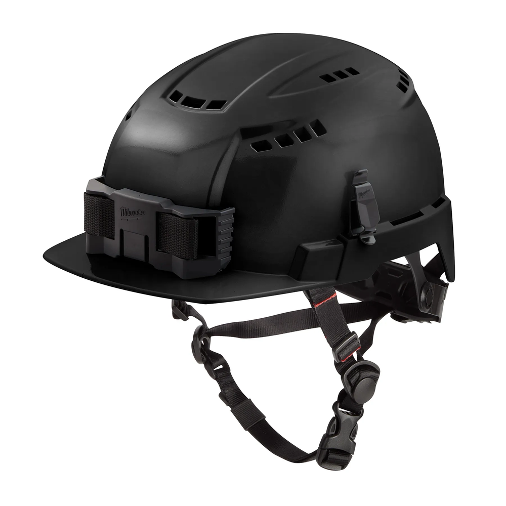 The Milwaukee BOLT Black Front Brim Vented Safety Helmet (USA) - Type 2, Class C offers superior protection and enhanced comfort for any job site. Engineered to protect against both top and side impacts, this helmet is designed for the modern professional. Its BOLT accessory system allows for seamless integration of additional personal protective equipment and accessories, adapting to your specific needs. Experience a secure and comfortable fit, ensuring you can focus on the task at hand without distraction.