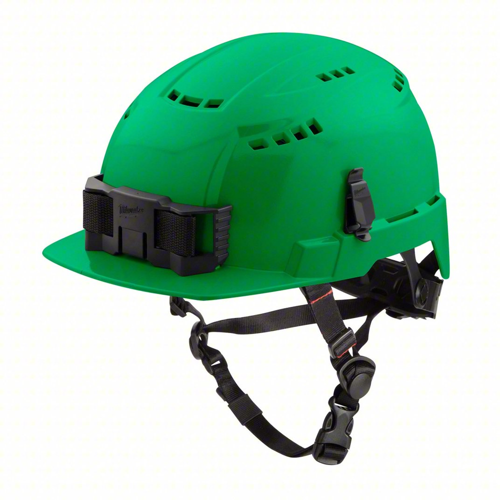 The Milwaukee BOLT Type 2, Class C Green Front Brim Vented Safety Helmet is engineered for superior protection and enhanced comfort on the job site. Designed to shield against both top and side impacts, this helmet is part of the versatile BOLT system, featuring four BOLT accessory slots and two universal slots for seamless integration of additional personal protective equipment. Its features include a BOLT Headlamp Mount for secure attachment of most headlamps and a BOLT Marker Clip for convenient access to writing instruments.