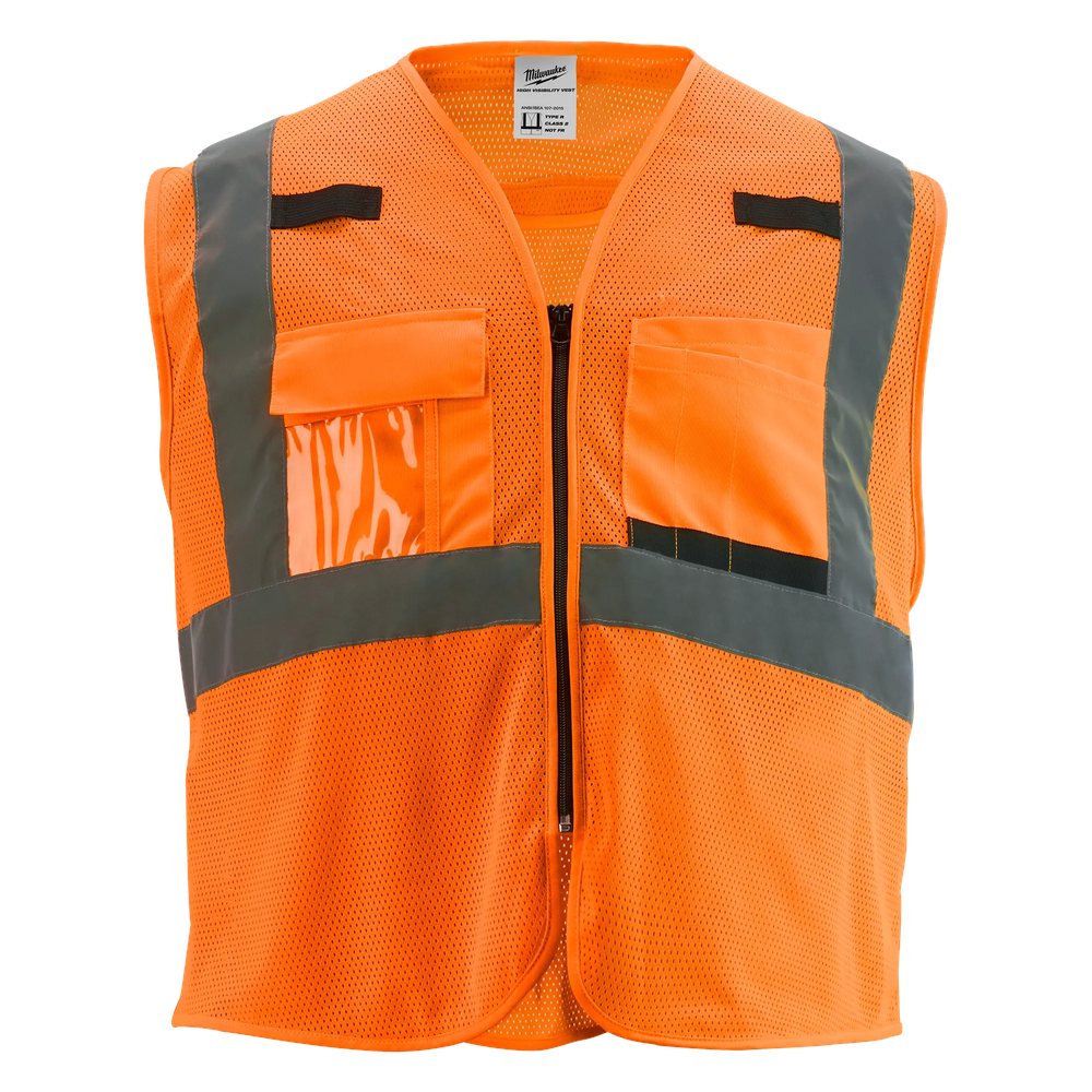 Stay cool and visible on the job with the Milwaukee Class 2 High Visibility Orange Mesh Safety Vest. This vest is crafted from lightweight, breathable mesh to keep you comfortable in hot working conditions. Designed for ultimate job site security, it features a reliable zipper closure and a durable pass-through slit for fall protection gear. Ideal for environments with traffic under 50 mph or heavy machinery, including construction, road work, and utility crews, this vest enhances your safety and provides convenient storage.