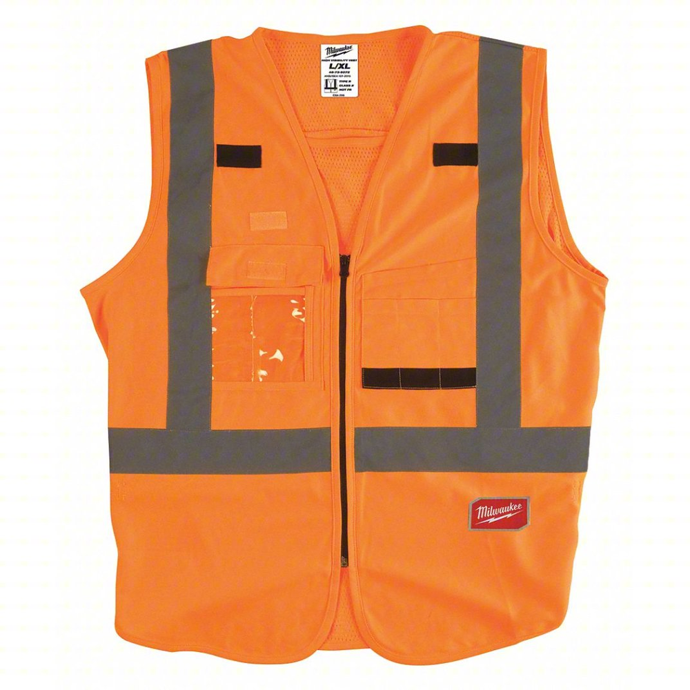 The Milwaukee Class 2 High Visibility Orange Safety Vest in size 2XL/3XL is designed for maximum safety and utility on the job site. Engineered to carry more, this vest features an impressive 10 pockets, including a clear ID holder and an internal pocket for convenient storage. Its quick internal size adjustment ensures a comfortable and secure fit, allowing it to be worn over various layers of clothing, from t-shirts to jackets. This vest is ideal for work environments with traffic speeds under 50 mph or around heavy machinery, such as construction, road work, and utility services.