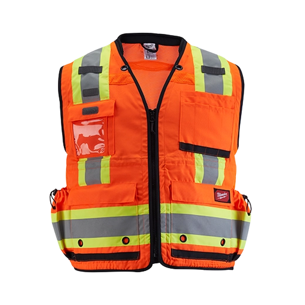 The Milwaukee S/M Orange ANSI Type R Class 2 Surveyor's High Visibility Safety Vest is engineered for maximum durability and storage capacity. Its tear-resistant 600D woven construction ensures it can withstand the toughest jobsite conditions. This surveyor's vest is designed to carry more with 27 pockets, including a rear tablet pocket, a clear ID holder, and an internal waterproof pocket. The moisture-wicking and anti-microbial fabric keeps you cool and dry while preventing odors, and a comfortable padded collar reduces neck pressure.