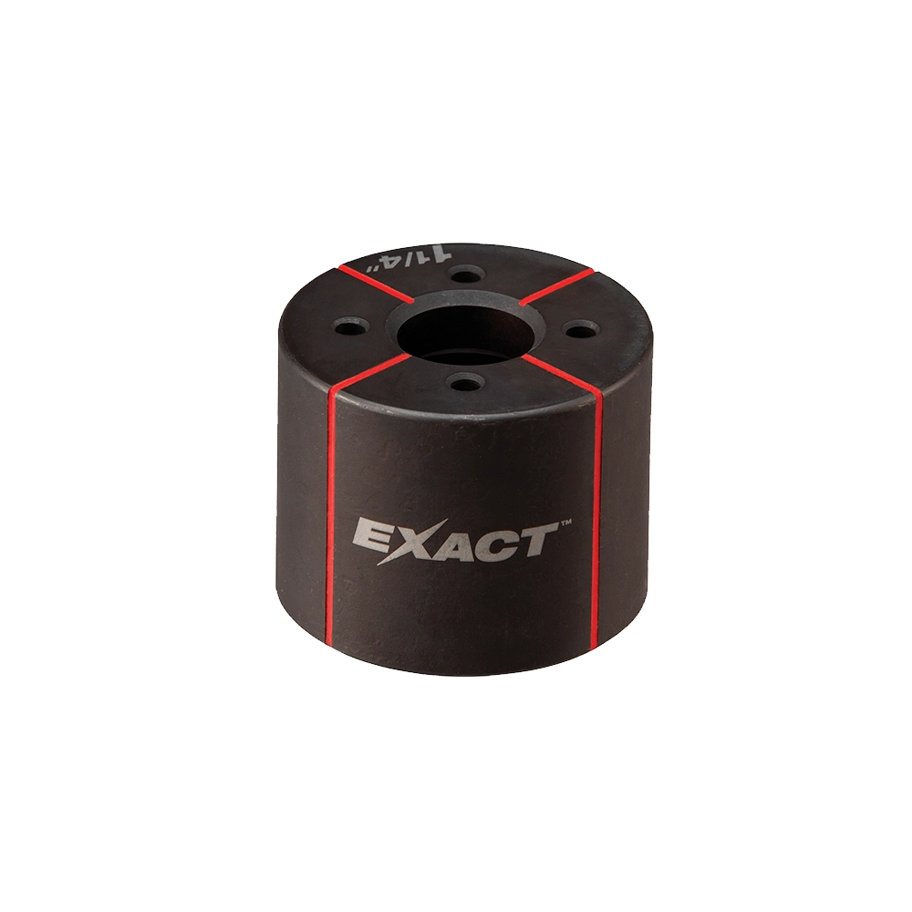 The Milwaukee EXACT 1-1/4' Die is designed for efficient and precise knockout work in electrical applications. It facilitates the creation of clean, burr-free 1-1/4' holes in both mild steel and stainless steel materials, up to 10-gauge and 12-gauge respectively. The die features innovative elements such as laser-engraved crosshairs for accurate alignment and slug removal ports to prevent jams and ensure a streamlined workflow. This heavy-duty die is built for professional use, offering durability and performance on job sites. It is compatible with Milwaukee M18 FORCELOGIC knockout tools and standard manual knockout tools, simplifying the punching process without the need for additional spacers.