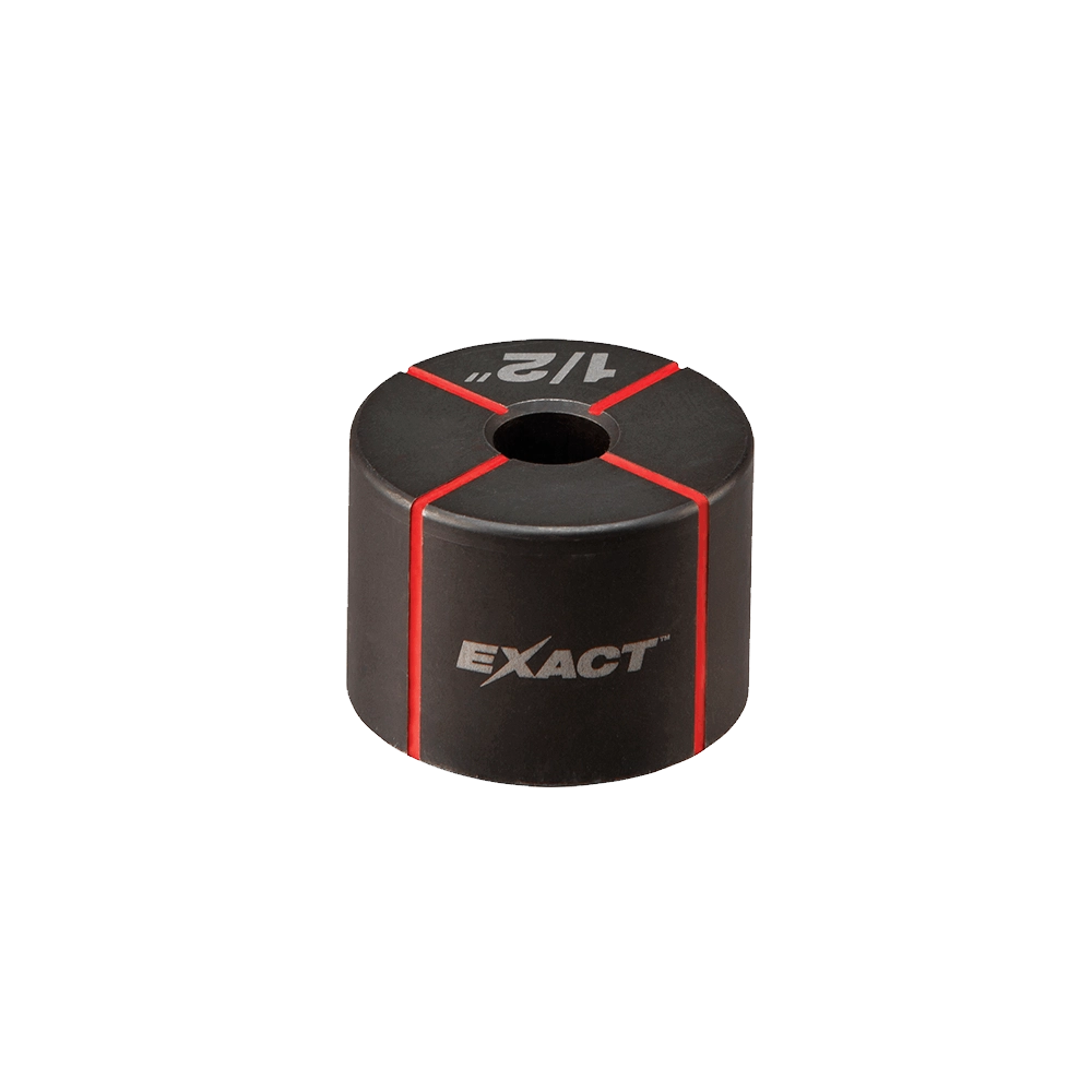 The Milwaukee EXACT 1/2' Mild Steel Die is a heavy-duty accessory designed for punching clean holes in both mild and stainless steel materials. It features laser-engraved crosshairs on the die for precise alignment with pre-drawn marks, ensuring accuracy in your work. With large size ID markings for easy selection and slug removal ports for optimal waste management, this die streamlines the knockout process. It's engineered to work seamlessly with Milwaukee's FORCE LOGIC knockout kits, making it an indispensable tool for contractors.