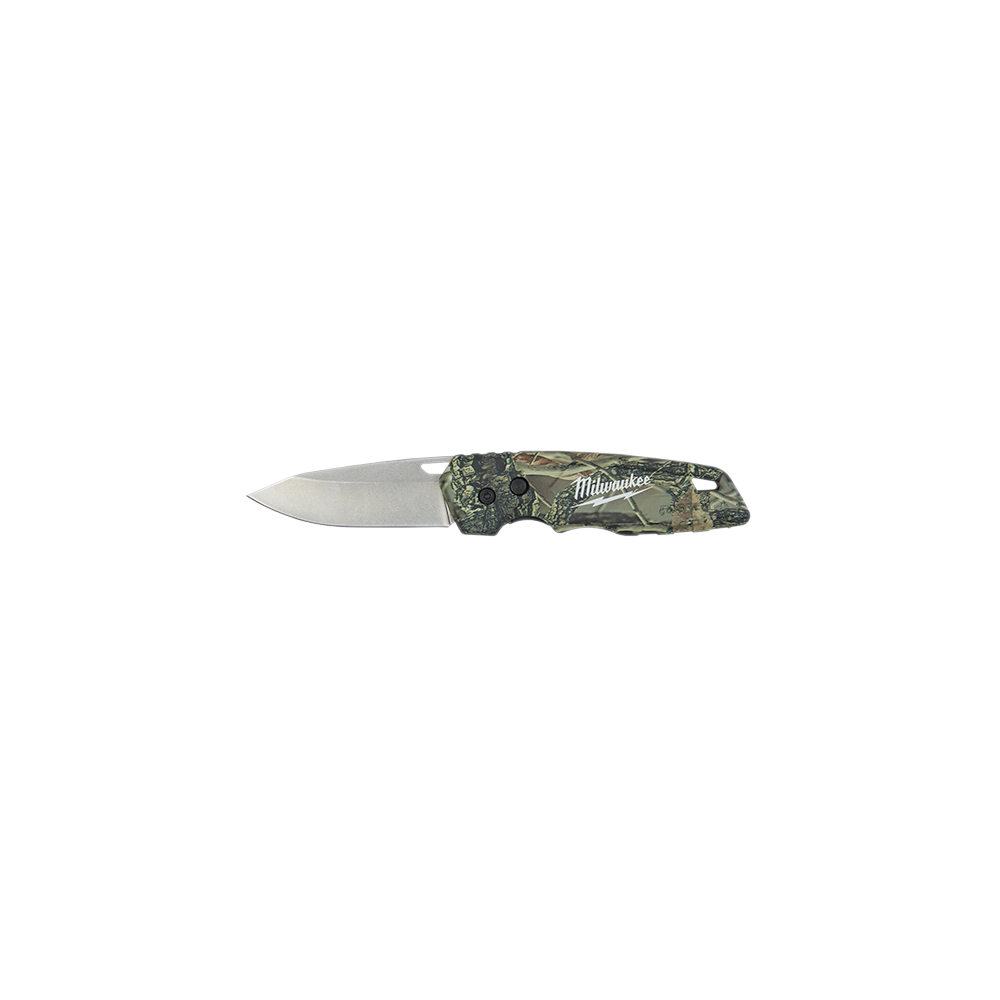 The Milwaukee FASTBACK Camo Folding Knife features a press and flip mechanism providing easy, one-handed opening for increased efficiency on the job. Its stainless steel drop point blade is engineered to stay sharp and resist corrosion under demanding conditions. Designed for durability and safety, the knife includes a liner lock to secure the blade and a tether-ready lanyard hole for secure attachment.
