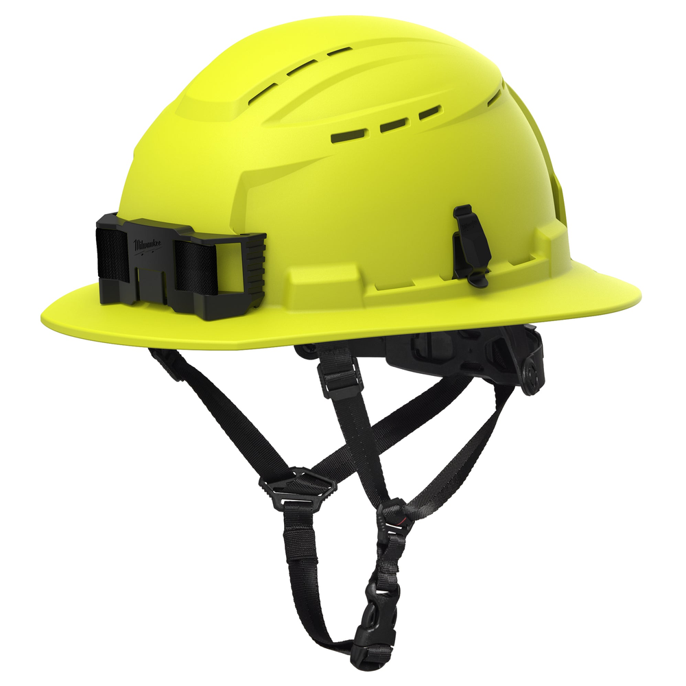 Introducing the Milwaukee FR HV-GN FL BRM HLMT VNT CLS C CST, a premium safety helmet designed for superior protection and enhanced comfort in demanding work environments. This helmet offers protection from both top and side impacts, ensuring user safety. It features the innovative BOLT accessory system, allowing for simultaneous attachment of various personal protective equipment and accessories. The helmet is engineered to be up to 15 degrees cooler than competing full brim helmets, providing all-day comfort. Its lightweight design and comfortable padded suspension with an adjustable ratchet ensure a secure and personalized fit. Enhanced with an antimicrobial sweatband and liner, it prevents odor and bacteria buildup, with removable and washable components for hygiene.